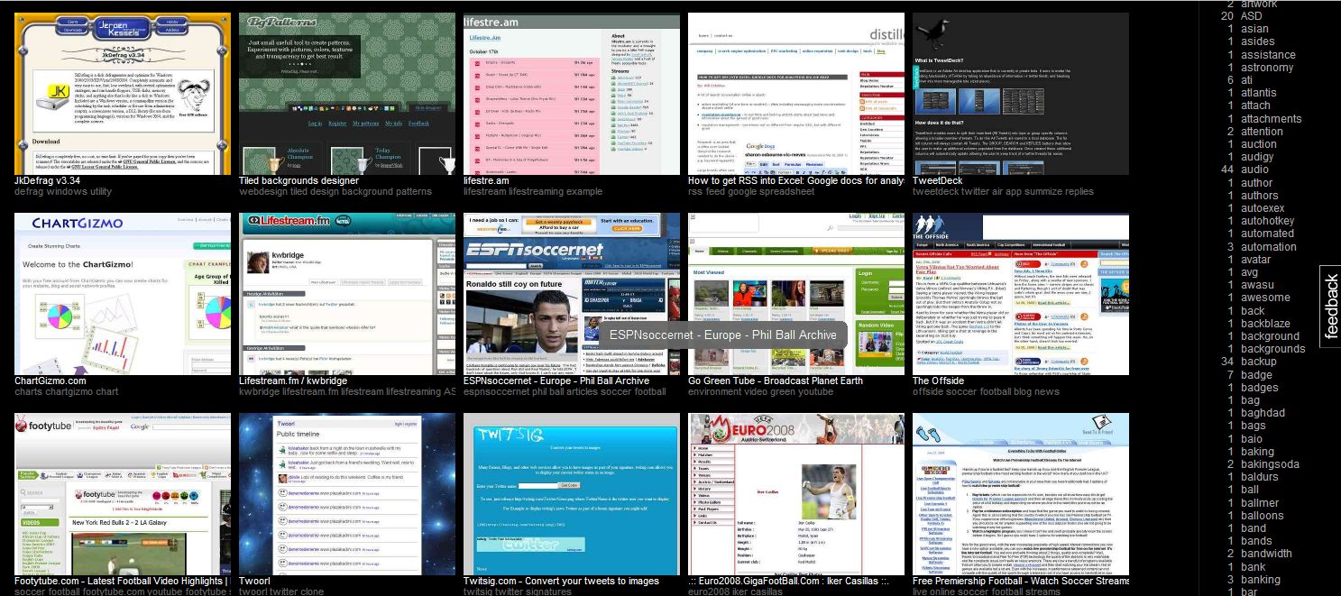 Fav Thumbs, created by one of the developers of Swurl, Ryan Sit, provides a graphical representation of your del.icio.us bookmarks. The idea behind this is that for many of us a picture jogs our memory more than a line of text does. It is also really pretty.